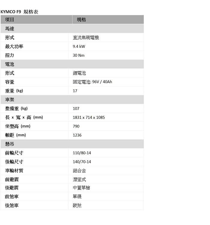 全球首創兩段自動變速150cc級距電動機車F9![]() 隨著電動車的發展,個人交通工具史上出現了最重大的轉變,有更多人願意投入電動車的懷抱,為推動地球環保與都市綠能而努力。然而,儘管全球已有許多電動機車上市,但至今仍未看到來自消費者的全心認同與市場的熱烈反應。其最大的挑戰在於:多數的電動機車以強調環保綠能做為產品最主要訴求。KYMCO長年研究騎士需求、傾聽消費者心聲,發表全新KYMCO F9都會運動型電動機車,提供在移動功能之外,更滿足消費者渴望追求感官刺激的騎乘體驗,讓電動機車成為消費者心目中的首選。