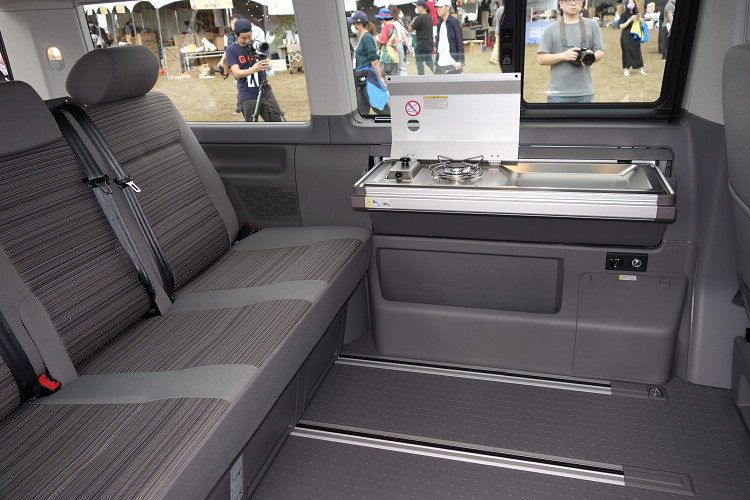 ![]() ▲車艙內左側首次配置隱藏式收折流理台,並在流理台左側增設單爐烹飪瓦斯爐。
