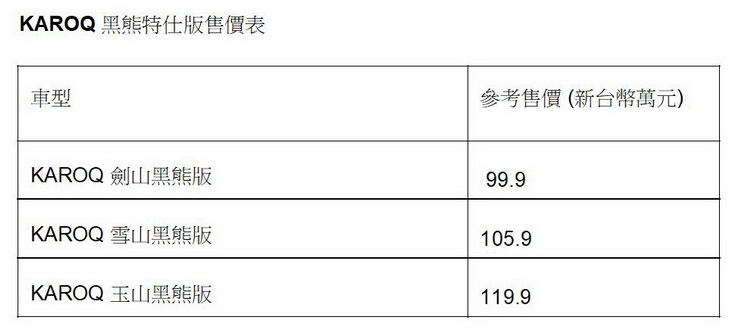 此次推出的 KAROQ 黑熊特仕版除了擁有 CNS 第三代資訊娛樂系統之外,懸浮式飛梭滾輪多功能方 向盤 (音響及電話控制)皆成為全車系標準配備。而之前在入門車款列為選配的車側盲點警示系統以及 後方來車警示系統,此次在同樣屬於入門款的「劍山黑熊版」已成為標配。
