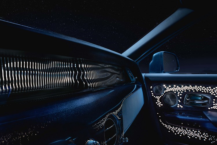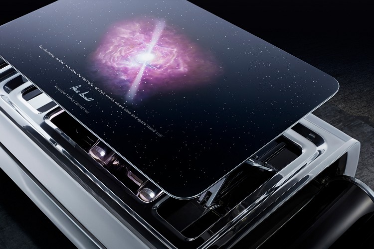 另外選配的香檳酒櫃巧妙融入了典藏版獨有的特質:表面為手繪脈衝星圖案,內裡功能則一應俱全,包括可冰鎮香檳和魚子醬的保溫壺、四支手工水晶香檳杯,甚至還配備有享用魚子醬的珍珠母小匙。其精妙的排布令人不禁想起勞斯萊斯的核心-V12引擎。