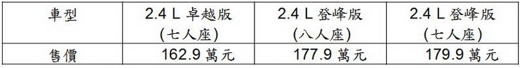 擴大乘員舒適便利性、車室靜肅性,打造人車一體的極致默契及創造極致感動的駕乘體驗 內裝部分本次改款除新增「Reservation Lock預約上鎖」功能、「Walk-Away Lock離開立刻上鎖」及「Hands-Free感應式電動尾門附自訂開啟高度記憶」等配備,以提升先進科技感受外,更將儀表升級為7吋「TFT彩色液晶儀表」,與類比速度表相結合,以容易理解及高辨識性的方式顯示各種資訊;通過增加駕駛座出風口伸縮置杯架和新的助手席隱藏式上掀置物盒,中央滑蓋式置物箱(登峰版七人座)、四個大電流2.5A安培USB充電端子(登峰版七人座),室內置物、機能空間變得更加便利使用。