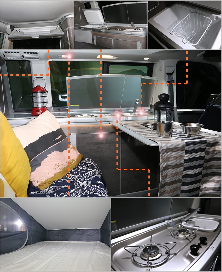 ![]() 作為露營車,後艙當然也有配備全功能的廚具配備搭配摺疊桌,包括42升冰箱、不鏽鋼清洗水槽及雙爐烹飪瓦斯爐;其餘露營裝備還有車頂置物櫃、置衣櫃和外接式沖洗設備,全車共有4組12V 120W和2組230V 歐規電源插座。乘客艙二人座椅有多段式前後移動的功能,向下摺疊就能打平變成舒適的臥鋪,加厚型床墊尺寸1.14mx1.95m;此外,駕駛艙座椅具備可旋轉設計,能180度轉向和乘客艙的二人座椅對坐。