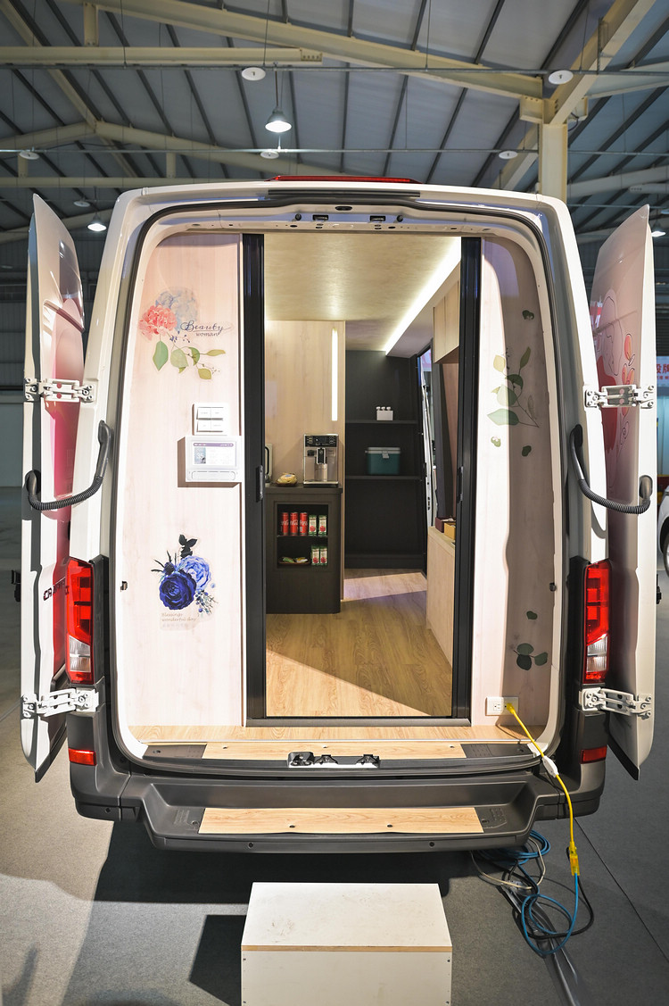 福斯商旅在台中2021商業車博覽會展出兩款特別車款,首先是以T6.1 Caravelle IPC無障礙福祉車為基礎,融合露營套件所推出的「T6.1 Caravelle青銀共享車」(售價213.4萬);另一款則是以Crafter為基礎,透過智慧科技具有零接觸式篩檢技術的「Crafter健康行動車」(售價488萬)。