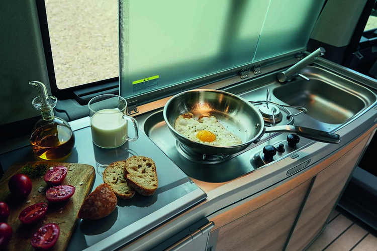 ![]() 車內標配「全功能流理台」,內附42公升溫度可調式冰箱、附水龍頭之不銹鋼洗水槽,以及雙孔瓦斯爐,下方亦具備廚具收納功能之櫥櫃。