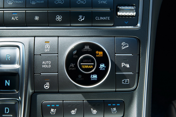 此外,新SANTA FE標配整合Eco/Comfort/Sport/Smart模式的DRIVE MODE ,更提供同級最先進 HTRAC 4WD智慧型可變四輪傳動系統 (柴油GLD-C車型專屬),智慧判別分配前後軸動力輸出,搭配TERRAIN MODE越野駕馭(Snow/Mud/Sand)多重模式輔助,隨時都能從容不迫征服領地。