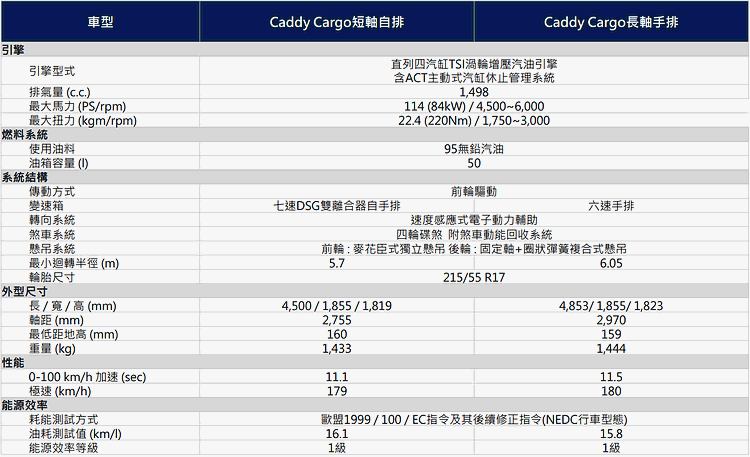 福斯商旅新世代Caddy繼引進乘用休旅版本之後,貨車版的Caddy Cargo現在也已在台上市。Caddy Cargo即為前代Caddy Van更名之後繼大改款,受益於轎式底盤一舉提升整體舒適及空間表現,更導入大量電子數位科技操作介面。長、短軸兩種車型,皆採用相同的1.5 TSI汽油引擎,分別搭配六速手排、7速DSG變速箱,配備水準均較前代明顯提升,不過價格也因此調漲許多,兩款車型售價都是82.8萬元。