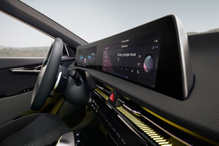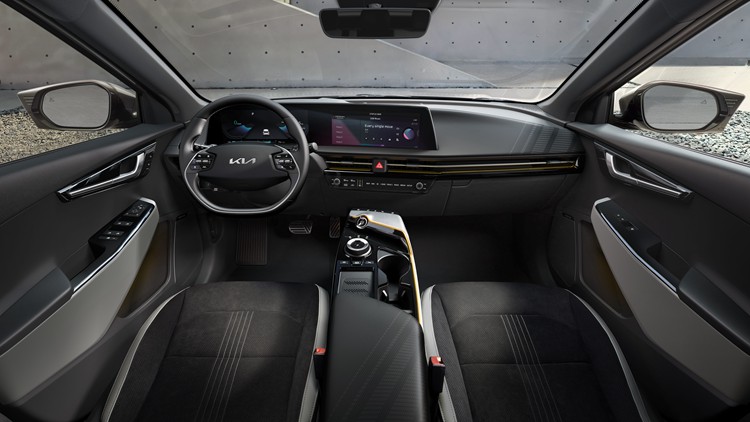 ![]() Kia EV6搭載雙12.3吋全景曲面顯示螢幕,搭配64色可調式氣氛燈,為車內的視覺感官帶來盛大饗宴,並與車外的劃時代美學設計相呼應,打造專屬EV6的美學氛圍。 ![]() ▲Kia EV6的外型與內裝設計以劃時代美學相呼應,為Kia新世代電動車寫下未來感十足的前瞻風格。