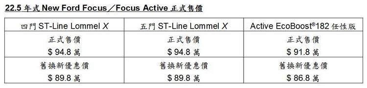 福特六和汽車四月發表22.5年式FORD Focus ST-Line Lommel X四門/五門與FORD Focus Active EcoBoost 182任性版,同步升級與德國製造進口Focus ST同級的12.3 吋全彩液晶智慧多功能儀錶板(價值3萬元),清晰易讀的儀錶板設計,不只方便駕駛者閱讀並掌握行車資訊,伴隨駕駛模式調整的視覺設計,時而優雅巡航,時而熱血奮進,充滿許多駕駛樂趣。此外,自上市起至5月31日止完成領牌,限時升級配件1E-Mirror電子式智慧後視鏡(價值19,800元)。