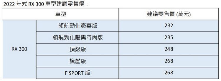 LEXUS 豪華休旅RX車系自1999年起導入台灣,20多年來憑藉其優異的造車工藝、出色的產品設計,以及提供完整豐富的主、被動安全系統,深受台灣消費者喜愛並穩坐同級距銷售冠軍寶座。去年推出的RX 300曜黑時尚版,導入黑化套件及職人工藝內裝提升整體質感,300台配額隨即銷售一空,也不免讓部份向隅的消費者為之扼腕。本次為了回饋廣大車主的支持,LEXUS特別針對2022年式之RX 300再次推出限量領航勁化車型,以豐富的科技便利配備,提供車主更超值有感的豪華休旅選擇。