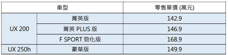 在整體原物料成本上漲的壓力下,‘23年式UX將維持各等級編成與販售價格不變,請參考下方表格: