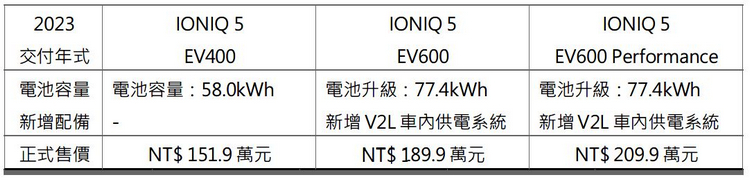 ![]() 針對新年式原廠推出EV600及EV600 Performance車型,搭載新超高容量77.4kWh電池,能耗續航里程大幅提高,同時新導入V2L車內供電系統,正式售價反映規格配備升級與匯率變動成本,EV600為$189.9萬元及EV600 Performance為$209.9萬元;入門款EV400維持搭載58.0kWh電量電池及規格配備不變,僅反映匯率變動成本後正式售價為$151.9萬。