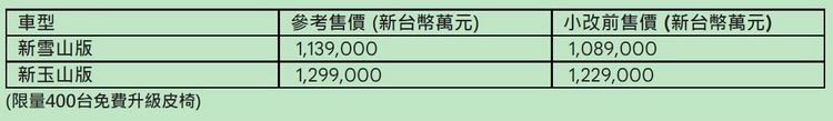 內裝部分,10.25吋全中文全彩數位儀表搭配9.2吋的CNS 3.0資訊娛樂系統。新雪山版採用的是亮銀髮絲紋飾板佐以舒適布紋座椅,搭配懸浮式飛梭滾輪多功能方向盤;進階的新玉山版SportLine則為Carbon跑車運動化黑色飾板配上跑車式布紋座椅,方向盤則為附換檔撥片、音響及電話控制功能的三幅跑車式多功能方向盤 。