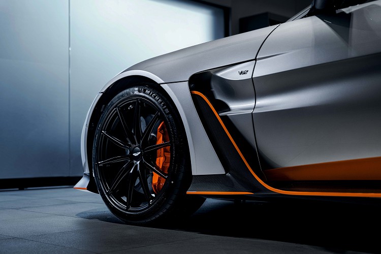 成就V12 Vantage優越動態性能表現的還包含兩款全新 21 吋輪圈— 消光黑色Y字型輪圈與消光黑色Y字型拋光輪圈可供選擇,同時亦可加費選配重量減輕8公斤的21吋消光黑色輕量化輪圈,輪胎的配置則是採用前輪 275/35 R21和後輪 315/30 R21的Michelin Pilot 4S 高性能輪胎。 迷人車身曲線 演繹極致車藝美學 秉持對性能駕馭的極致追求與毫不妥協的美學標竿,V12 Vantage 擁有迷人的車身曲線,歸功於加寬約 40 毫米的車身設計,用來搭配為了彎中動態與穩定性所優化的寬體底盤,全新寬體設計廣泛使用碳纖維材質,同時具備引人注目的空氣動力學套件。