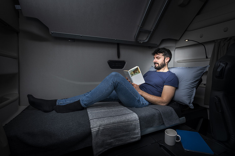 夜間休息區的對稱式佈局設計,配置頂級AS寬車頭帶臥鋪駕駛座艙、一體式上下鋪提供舒適床墊、旋轉開關可以控制燈光與光線明暗,讓駕駛能舒適休眠。