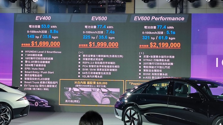 註2:Premium Package選配加價$70,000元(僅限EV600 Performance車型受訂生產)