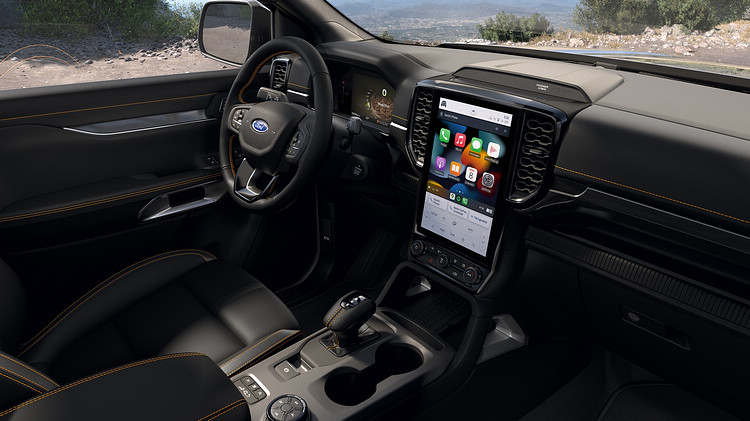 車室跳脫傳統皮卡商用車的設計框架,帶來更具科技氣息的數位化科技座艙。具客製化機能的8吋全彩液晶智慧多功能儀錶板,帶來清晰簡潔的視覺介面;中控台則是可見Ford全新開發的SYNC 4A娛樂通訊整合系統打造出色的人因介面,讓各式車輛常用功能在操作上更為直覺。除了一般螢幕觸控及按鈕、旋鈕控制外,SYNC 4A娛樂通訊整合系統更提供了對話式聲控系統、無線Apple CarPlay/Android Auto、以及線上車主手冊等多項便利機能,帶給消費者便捷的科技使用氛圍。