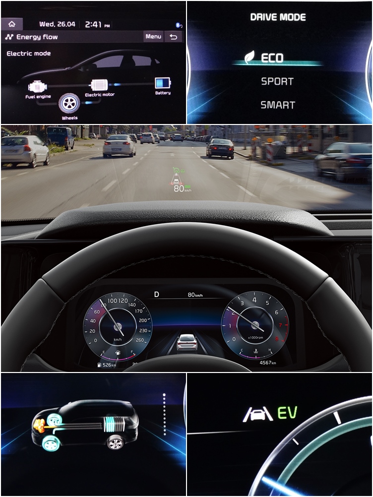 這款車也是Kia首款採用1.49kWh(270V/5.5Ah)電池規格的油電車,電池組位在後座下方,作為驅動前軸電動馬達(44.2kW/264Nm)的電力來源。在起步與輕度加速時,車輛能以純電方式行駛,在走走停停的交通路況中可協助降低油耗;當全加速時,汽油引擎與電動馬達將同時運作,讓車輛獲得更充沛的加速動能;而在車輛減速時,再生煞車系統會將動能轉成電能儲存於電池,供車輛日後使用,達成16.9 km/L的優異成績(WLTC測試值)。