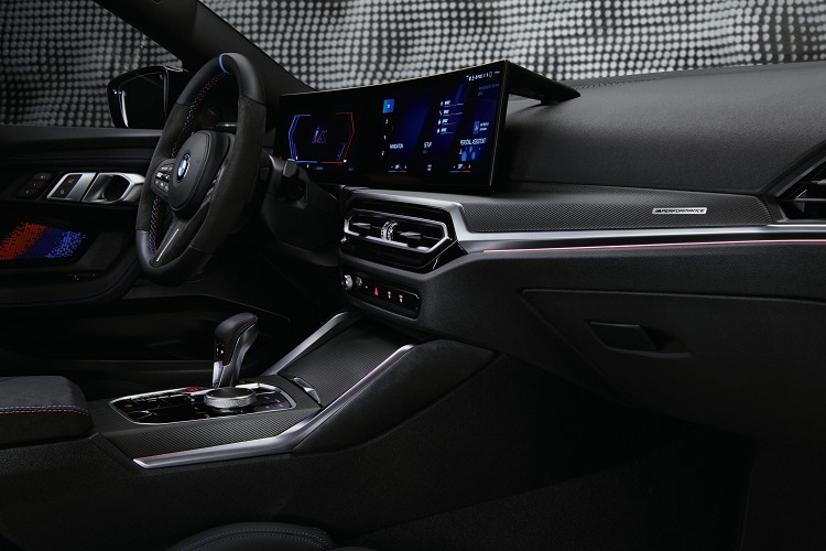 經典的駕駛導向設計搭配大量的M專屬風格,包含M專屬紅色引擎啟閉鈕、M多功能真皮方向盤搭配專屬縫線、M縫線安全帶以及絢麗奪目的M光影車門飾板等,為全新世代BMW M2打造出極具熱血氛圍的車室空間;首次出現在BMW車款中,以M品牌三色識別色彩包圍的Vernasca真皮M雙前座跑車座椅,以黑色皮革對襯鮮明的藍、紫、紅色彩,點綴發光的M2車型銘牌標誌,是此次全新世代BMW M2的內裝重點之一,後座採用40/20/40分離可傾倒後座椅背,讓空間更能靈活運用。另車主也可選用Merino真皮M碳纖維賽車桶型座椅,除可為車輛減少10.8公斤的重量,更完美地符合駕駛在賽道上極需的支撐與包覆性。