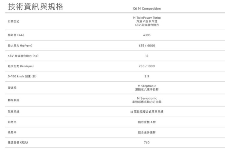 BMW X6 M Competition建議售價:760萬元