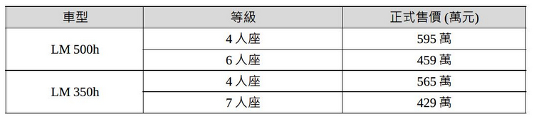 大改款LM採用GA-K平台開發,導入2種全新Electrified動力系統,展現品牌電動化發展之決心,其中LM 500h採2.4L渦輪油電複合動力系統,最高可輸出371匹綜效馬力,搭配DIRECT4電子式四輪傳動系統,能有效分配前、後輪輸出,並提升車輛循跡穩定性。 另LM 350h採2.5L油電複合動力系統,搭配E-Four電子式四輪傳動系統,亦可輸出250匹綜效馬力。同時,2種動力皆採用雙極鎳氫電池科技,帶來更即時的動力反應及充放電速度,且特別配有LM專屬Rear Comfort行車模式,透過動力系統、驅動系統與煞車系統的完美搭配,讓車輛能維持平穩舒適的動態表現,使 LM層峰客群在移動過程中都能享有舒適愜意的體驗。