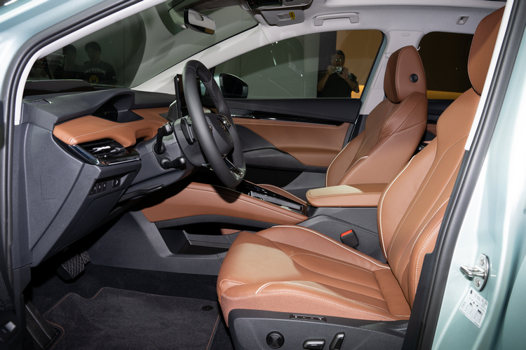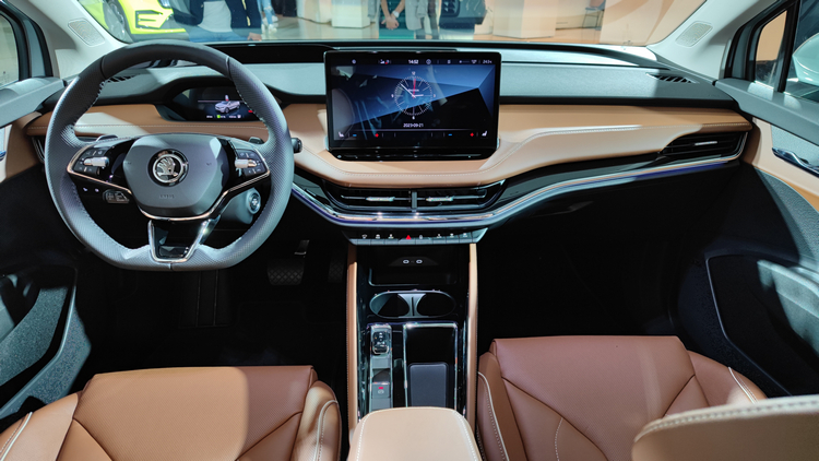 車室內,中控台配置13吋螢幕的影音資訊通訊系統,也可選配具有擴增實境功能的台頭顯示投射幕。內裝材質上也使用了可生物分解的環保材質如olive leather(橄欖油皮),更有多種客製化部品提供車主選擇。另外,多項「Simply Clever」的貼心設計在車內也是處處可見。