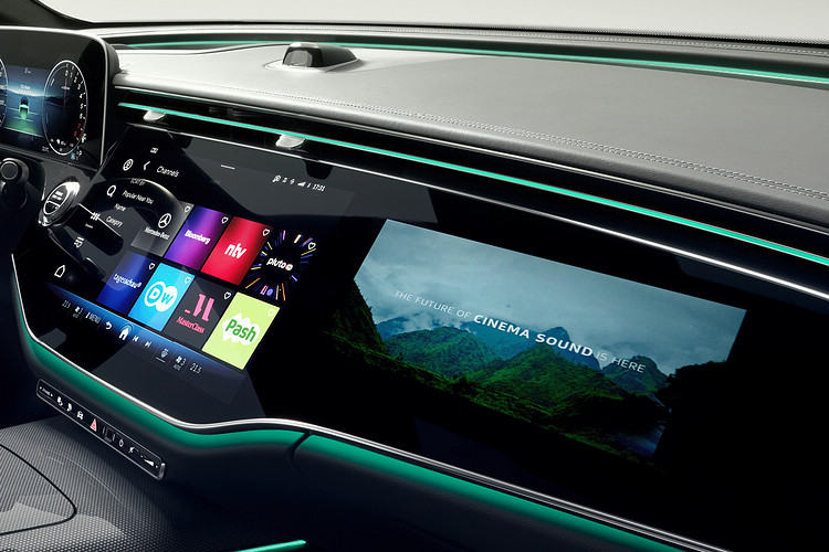 座艙可選配大面積高解析螢幕 MBUX Superscreen 寬幅螢幕,以及Dolby Atmos 杜比全景聲環繞音效的 Burmester 4D 環場音響系統,以17支喇叭730瓦創造身歷其境的環繞音效,主動式環景氛圍燈可隨音樂旋律改變氣氛燈舞動的節奏。