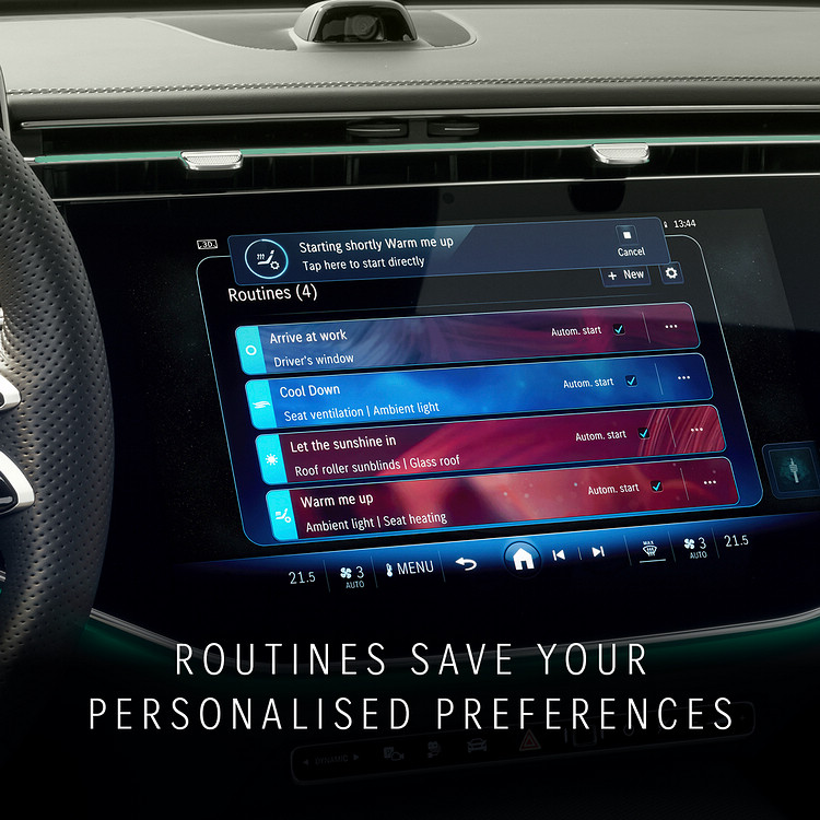 全新 E-Class 導入全新世代的 MBUX 車載系統,數位體驗更加流暢。並結合 AI 人工智慧,語音助理能辨識更多自然語言的操作指令,也能在指定條件下啟用 “Just Talk” 功能,直接與語音助理對話,並可透過Routines功能達成自動化的目標。