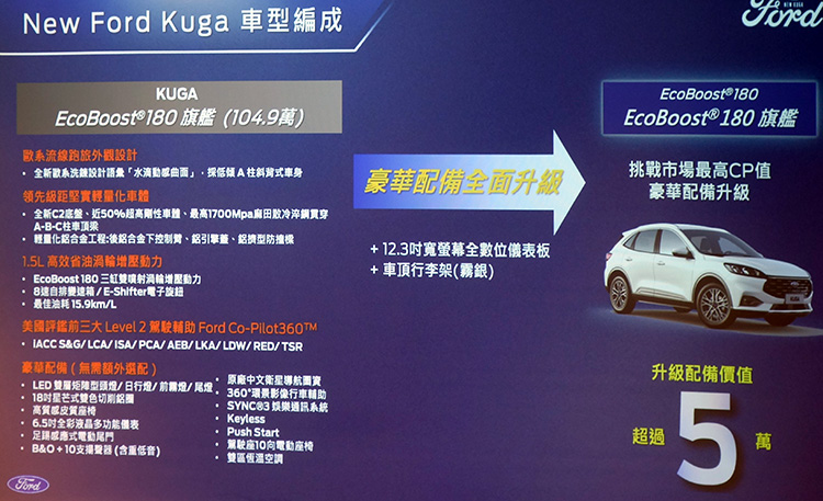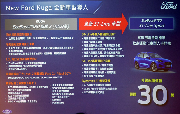 Ford Kuga新年式調整配備及編成,為強調車系運動化特質的產品優勢,推出搭載1.5T動力的EcoBoost 180 ST-Line Sport 全新車型,標配ST-Line專屬內外觀套件及智慧燈組等配備,售價107.9萬元;至於原本搭載2.0T動力之EcoBoost 250 AWD ST-Line,則更名為250 AWD ST-Line Performance,配備同步獲得升級,售價119.9萬元。