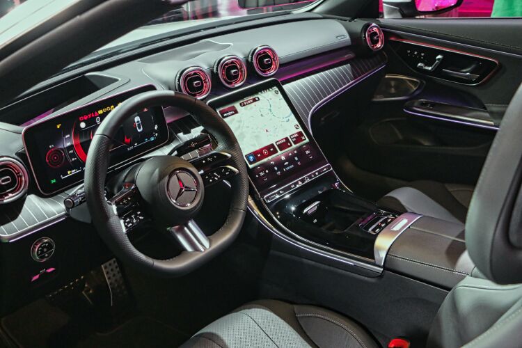 頂蓬提供黑色、灰色和紅色三種選擇,擋風玻璃上緣與後座頭枕後方則設置電動升降的阻風板減少亂流,車內座椅也有頸部暖氣系統,與雙前座通風加熱座椅搭配。此外,中央11.9吋觸控螢幕則具備15至40度電動角度調整機能,用以避免反光。全車系採用最新MBUX多媒體系統,並有64色進階環景內裝照明及Burmester 3D環場音響系統和17具揚聲器等配備。
