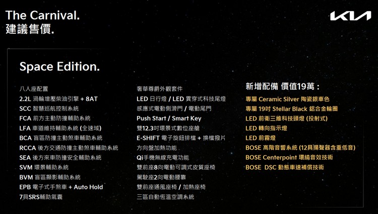Kia總代理台灣森那美起亞向韓國Kia原廠爭取引進100輛Kia Carnival Space Edition特仕車,透過專屬車色及多項升級尊榮豪華配備,提供更具個人風格的豪華八座MPV,正式售價204.9萬。本次新車選在上賀汽車全新開幕的桃園3S展示中心首次發表,同時也展現Kia總代理台灣森那美起亞在地化經營、深耕國內市場的決心。