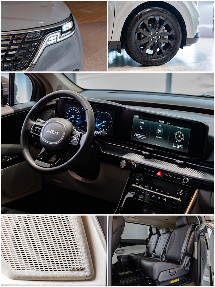 內裝部分,使用黑灰雙色打造沉穩大器的車室氛圍,並升級原本頂級車型獨有的12支揚聲器BOSE環繞音響系統,提供尊榮的影音享受。Carnival Space Edition搭載12.3吋整合智慧型全數位儀表板,搭配12.3吋多媒體影音觸控系統,打造出Panoramic環景式數位座艙。此外,雙前座搭載8向電動可調式座椅,並具有通風和加熱功能,提供更加尊榮款待的舒適駕乘體驗。