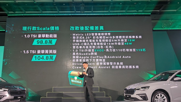 Scala於去年八月在歐洲進行小改款,現在也正式引進國內。Škoda Taiwan也同時宣布只要在8月31日前完成掛牌,即享早鳥免費升級駕馭樂趣套件(價值新台幣5萬元),套件包括駕駛座八向電動調整座椅、方向盤換檔撥片和駕駛模式選擇功能,進一步提升駕駛舒適性與駕馭樂趣。