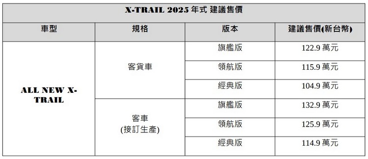 國產中型運動休旅NISSAN X-TRAIL 25年式五月正式上市,新X-TRAIL訴求科技升級不加價,以「三大完勝」休旅打造卓越產品力:「動力完勝」採用VC-TURBO 1.5T可變壓縮比引擎創造同級最佳動力與節能;「安全完勝」獨家PFCW 超視距車輛追撞警示系統與 RR-AEB 後方緊急剎車系統,提供全方位的安全守護;「科技完勝」新增四螢幕連動功能並支援無線 Apple CarPlay 與無線 Android Auto智慧手機連結功能。