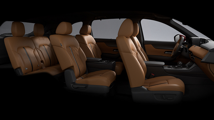車艙採用大量柔軟麂皮質感絨料,輔以高貴的暖沙棕配色、棕黑雙色真皮包覆方向盤與暖沙棕菱格紋 Nappa 真皮座椅,營造出豪華且兼具細膩質感的座艙氛圍。全車系座艙配備12.3 吋全數位多功能儀錶與 12.3 吋中央資訊顯示幕的雙大型顯示幕,支援Android Auto 與無線 Apple CarPlay操作。
