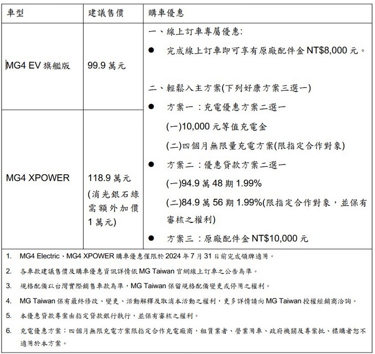 受到國內消費者高度關注的全新MG4 跨界純電休旅於6/13隆重上市,MG Taiwan正式公佈車系旗下雙動力車型建議售價,分別為MG4 EV旗艦版99.9萬元、MG4 XPOWER 118.9萬元,並同步自6月15日起進駐全台MG展示中心,全面展開全新MG4跨界純電休旅的賞車與試駕活動。