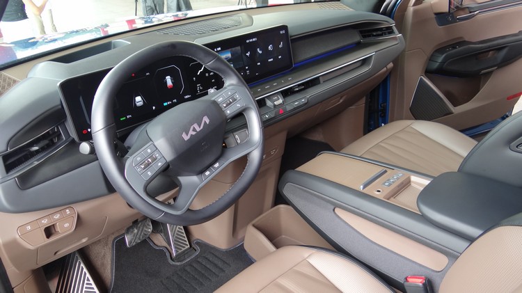 在內裝上,一體式全景顯示螢幕打造貼心便利及科技氛圍的體驗。GT-Line六人座可選配電子數位後視鏡套件(+10萬元),包含車外電子數位後視鏡以及車內電子數位後視鏡,據稱訂車的消費者有五成都選配了這項配備。此外,EV9還搭載Meridian頂級環場音響系統與10種自然之聲,提供乘客環繞的音樂饗宴。