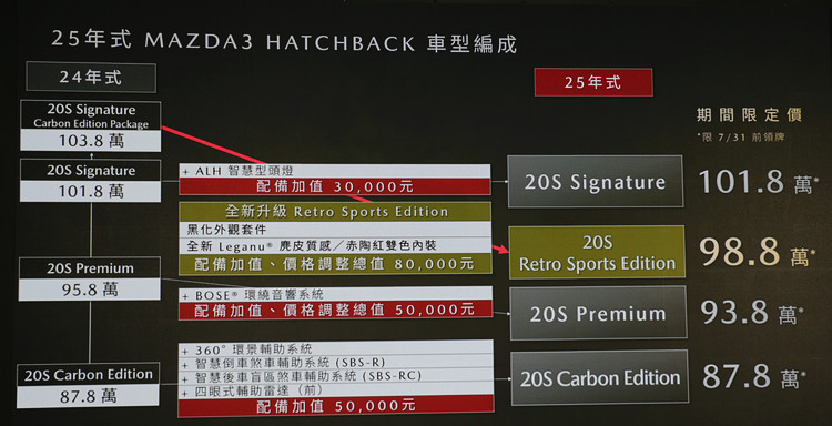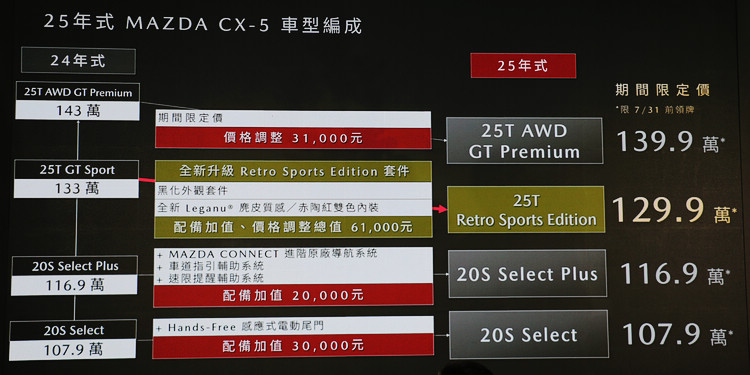 台灣馬自達在台成立十週年,特別針對Mazda3、CX-30及CX-5導入Retro Sports Edition 紀念車型,同時新年式三款車系的編成、配備都進行調整,新增導入360°環景輔助系統、電動尾門等標配,其中多款車的售價直接調降,以更具競爭力的優勢持續挑戰市場同級對手。