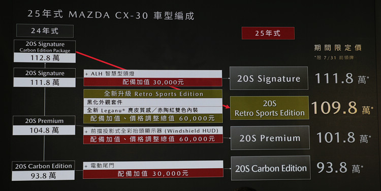 CX-30 (售價皆為7月底前入主限定)![]() CX-30入門車型20S Carbon Edition升級電動尾門,售價93.8 萬元(維持不變)。