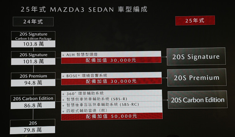 Mazda3 (售價皆為7月底前入主限定)![]() 新年式其中Mazda3入門車型 20S Carbon Edition升級標配 360° 環景輔助系統、智慧倒車煞車輔助系統 (SBS-R)、智慧後車盲區煞車輔助系統 (SBS-RC)與前四眼式輔助雷達,總值5萬元,售價86.8 萬元(維持不變)。