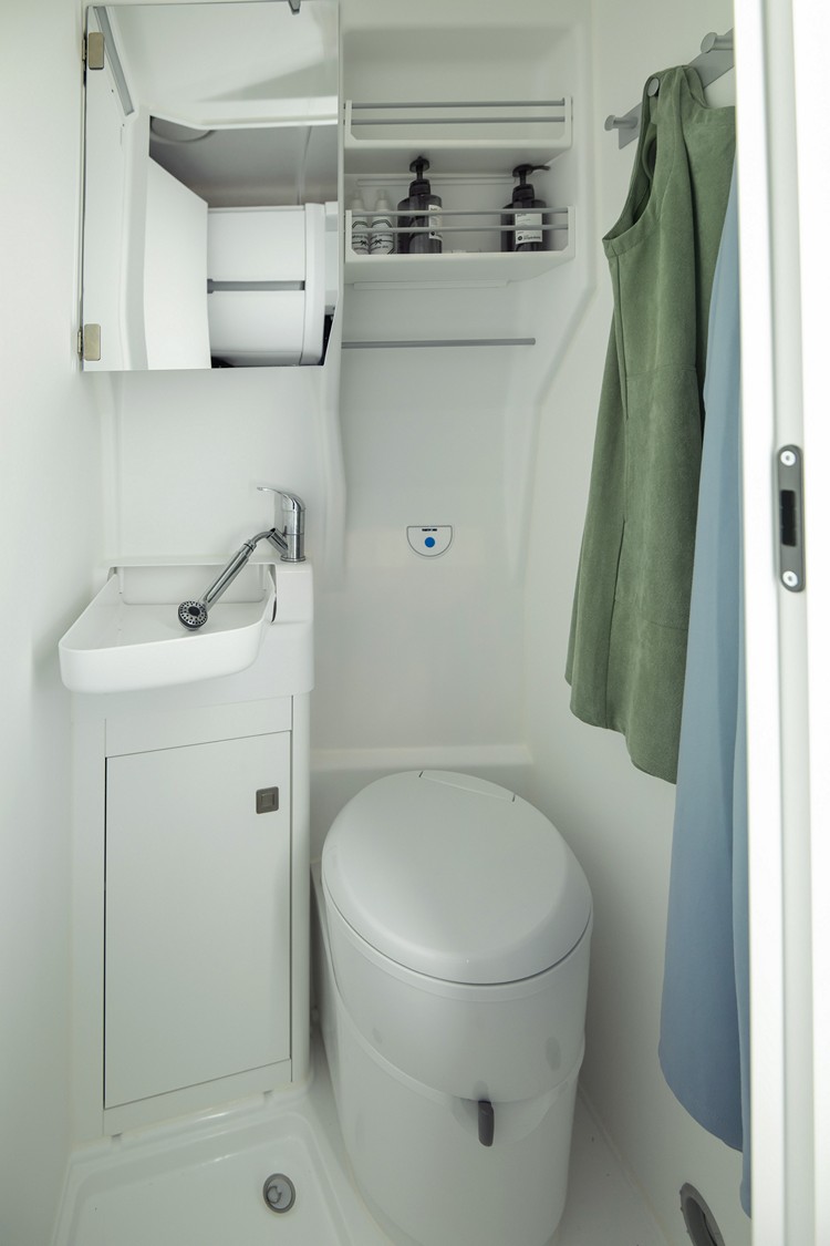 二、專屬便利的「衛浴區」:擁有820mm x 820mm x 2000mm (長寬高)的獨立衛浴空間及設備,提供乘員如家一般舒適安心的沐浴時光。此外,車內分別配置110公升的清水箱、可容納90公升洗滌污水的灰水箱,以及沖洗馬桶的18公升黑水箱設計。