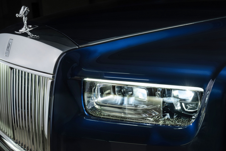 進氣格柵巧妙的幾何設計、雙R車標與歡慶女神交相輝映。格柵採用LED光源發光式設計,該發光格柵設計在 New Ghost 中首次亮相並加以推廣。前大燈設計在全新 Phantom Series II上採用鐳射切割,呈現仿若星光般的質感,該設計與車內的星光頂篷相互呼應,為夜間駕乘增添驚喜和愉悅之感。