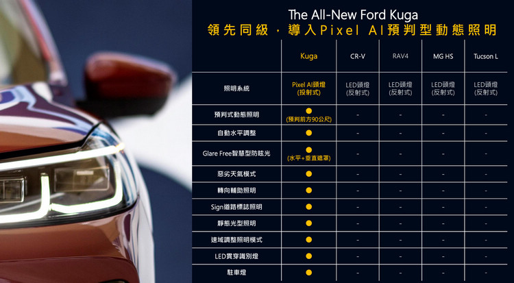 外觀升級![]() ▲小改款Kuga導入Pixel AI預判型動態照明、Co-Pilot360 Vision 2.2科技等多項先進科技,並提供拳擊國手林郁婷搶先長期試駕體驗新車。第三代Ford Kuga在2020年上市以來,以「雙動力、三外觀」的產品模式持續於台灣中型休旅市場佔有一席之地。本次推出的中期改款在外觀設計、動力系統、變速系統、駕駛輔助、配備水準和智能科技等面向都進行了全面的提昇,整體升級的幅度可謂不小;不僅如此,為避免重蹈覆轍,福特六和甚至還將小改款國產新車送往歐洲進行嚴苛的撞擊測試,以確保前方偏撞和兒童保護裝置的安全水準能與歐規同級 ![]() ▲1.5T Active及2.0T AWD ST-Line車型,首度導入Ford最新Pixel AI預判型動態照明系統,大幅提昇整體燈具照明效果,提升夜間行車安全。
