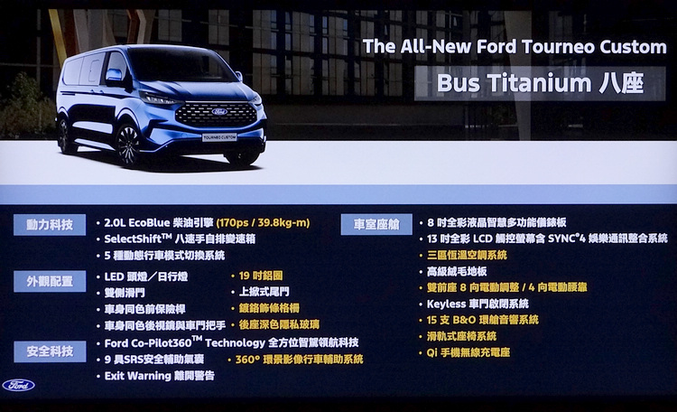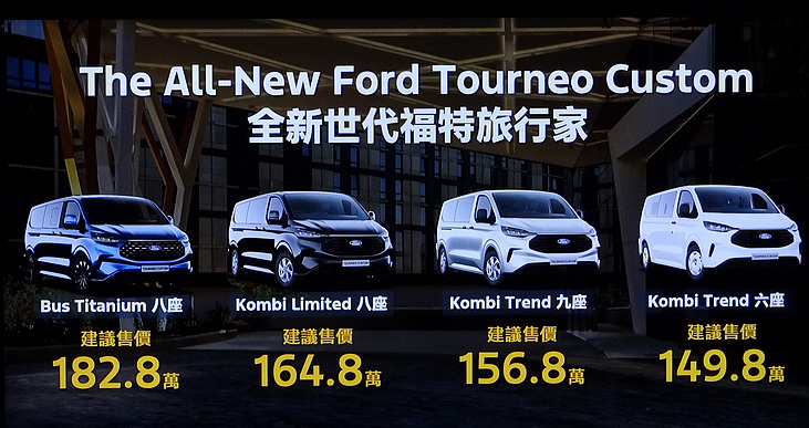 Ford Tourneo Custom福特旅行家車系在台推出大改款,搭載全新底盤設計帶來更具餘裕的座艙空間彈性,搭載更進化的數位座艙、科技配備及駕駛輔助系統,共導入Kombi Trend六座(149.8萬元)、Kombi Trend九座(156.8萬元)、Kombi Limited八座(164.8萬元)以及Bus Titanium八座(182.8萬元)共四款車型編成,價格設定相當具有競爭力。