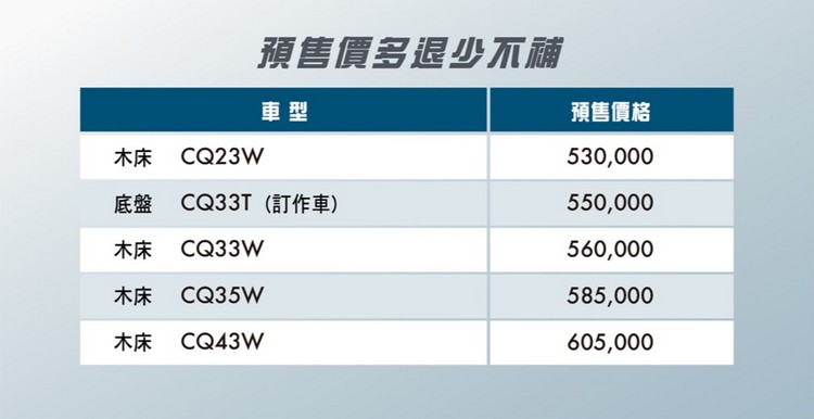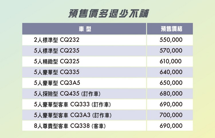 全新J SPACE的優異規格,提供給消費者最佳生活提案,廂車車型預售價為舊換新50萬起;<三冠王>貨車車型同步推出,舊換新48萬起。為歡慶J SPACE預售啟動,即刻入主除享市價12,000元配件金,當月領牌再享好禮(貨車贈貨斗防護板;廂車贈尾門照地燈),