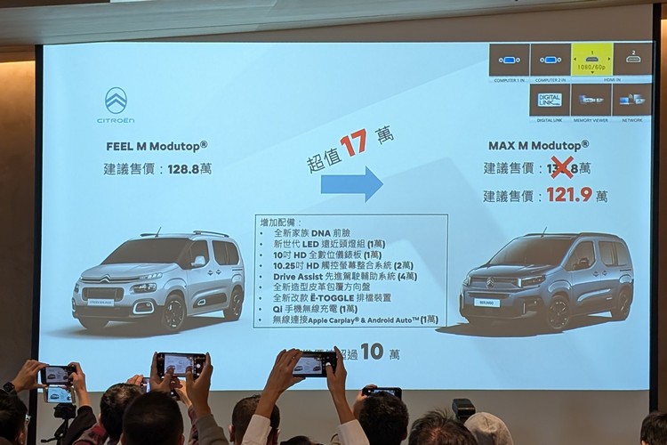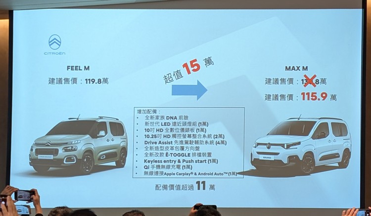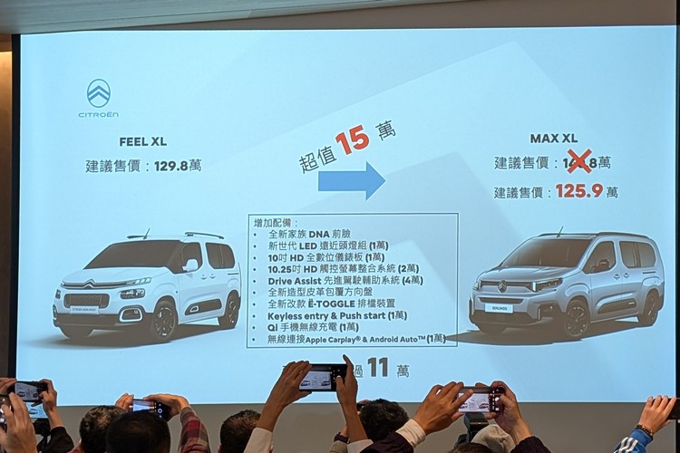 NEW CITROËN BERLINGO全車系115.9萬元起,除了較前一代車型售價調降最多7萬元之外,全新CITROËN品牌造車語彙,全新Bi-Panel數位座艙、Level 2智能安駕ADAS系統等配備全面升級再進化;同時,為歡慶NEW CITROËN BERLINGO全新上市,寶嘉聯合特別推出首批限量優惠,2025年1月24日前入主「NEW CITROËN BERLINGO乘用車型並完成領牌」,即可享5年 / 15萬公里延長保固,獨享首購專屬回饋禮遇,加計總和超過20萬元的超值回饋。即日起,CITROËN BERLINGO將進駐全臺CITROËN展示中心,並在本週末2024年12月7至8日舉辦店頭發表活動。