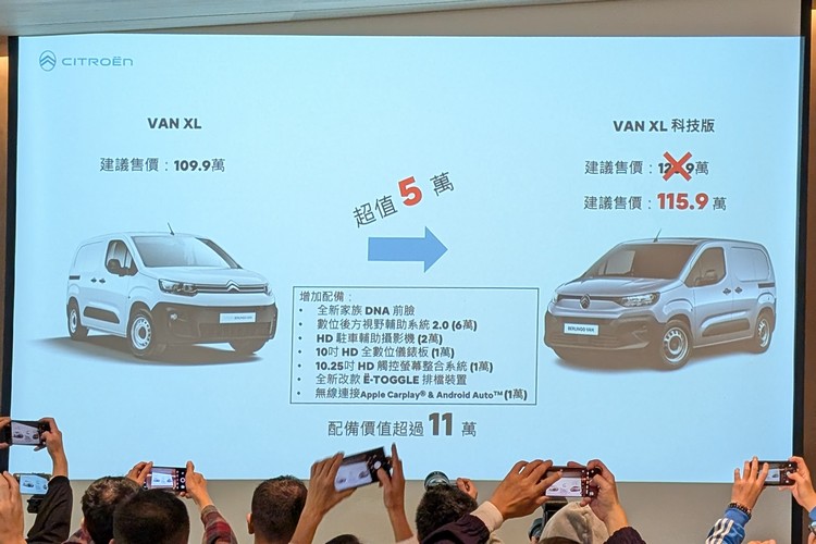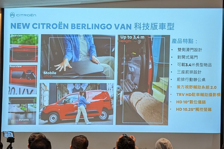 職人最佳工作夥伴 — 「 VAN 科技版」 同步上市 商用車型 NEW CITROËN BERLINGO VAN 科技版也同步發表,建議售價 115.9萬元起。以獨特的前座三座椅配置與全隱蔽式貨艙方正格局,輕鬆乘載最長3.4米的長形物件,搭配對開式尾門設計,提供便利的裝卸體驗;高效節能動力則帶來卓越的經濟效益。