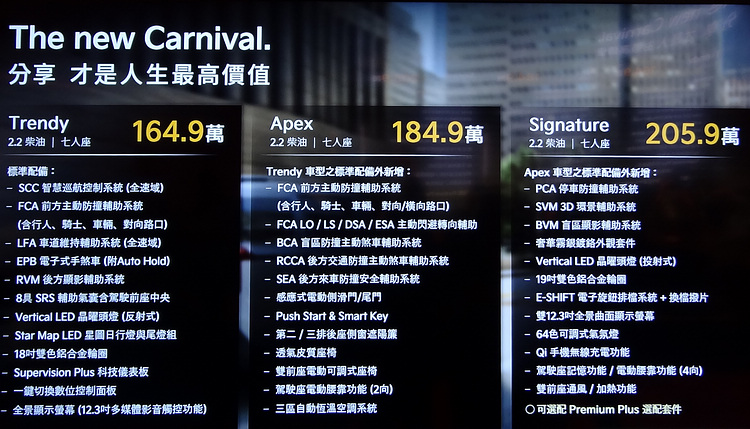 Kia總代理台灣森那美起亞在台推出小改款Carnival七人座豪華休旅,導入EV9全新設計外觀及雙12.3吋全景曲面顯示螢幕等設計,諸多科技及舒適配備皆有升級,動力則維持2.2升柴油渦輪引擎,車系編成及售價分別是:Trendy(164.9萬)、Apex(184.9萬)、Signature(205.9萬)。