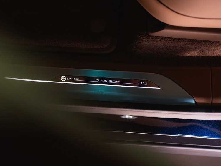 為彰顯追求極致的客戶所創造出真正獨特和個性化的體驗,每張座椅肩靠都繡有獨特的台灣標誌性山脈的等高線輪廓圖,包括玉山山脈、阿里山山脈、雪山山脈和中央山脈,高達9萬針的刺繡縫線,展現 SV Bespoke 無與倫比的細緻工藝。內裝搭配SV Bespoke專屬的棕色白樺木飾板、中央控制介面上的緞光黑色陶瓷排檔桿與啟動按鈕,呈現恰如其分的奢華質感鋪陳。SV Bespoke 細節包括繡有 Taiwan Edition 專屬字樣的兩組後座 SV腰部靠枕與標示著「1 of 9」的金屬門檻飾板,彰顯車款的珍稀地位。