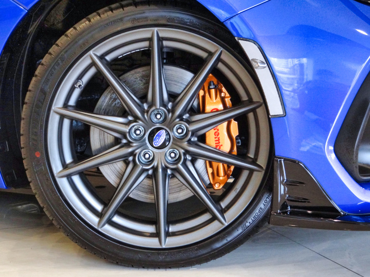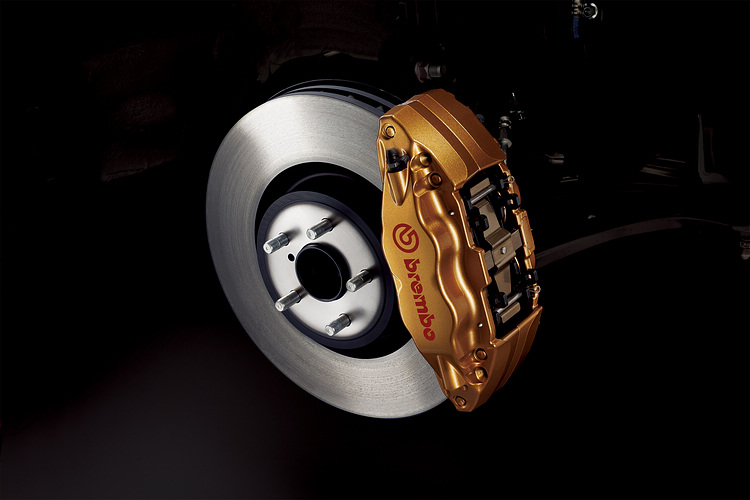 BRZ STI Brembo極速性能限量版搭載金色外觀的Brembo卡鉗設計,前輪卡鉗本身也從原本標準車型的雙活塞升級為對向4活塞的配置,後輪則是從單活塞升級至對向雙活塞的版本。
