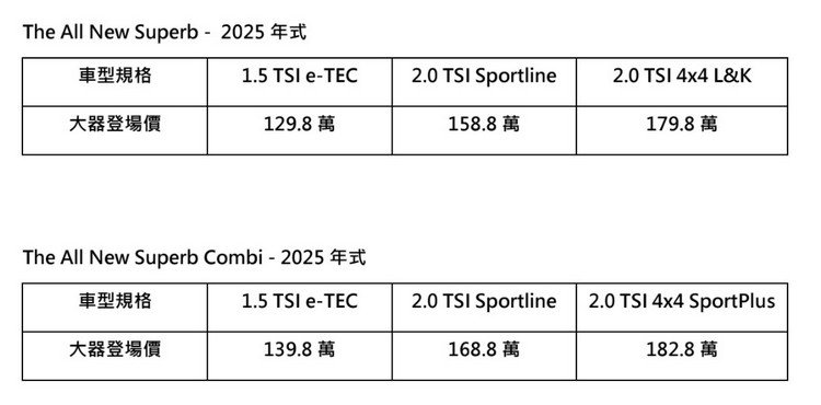 專為追求運動風格與個性化品味的客群所量身打造的 SportPlus 旅行車車型集結動感造型與高階運動調 校於一身,以超級旗艦姿態詮釋歐洲中大型旅行車的運動美學新典範。外觀透過運動黑化元素勾勒鮮明 辨識度,包括專屬水箱護罩、後視鏡蓋、窗框飾條、前後保險桿造型件與 4x4 車尾銘字,搭配 19 吋雙 色切削鋁圈與車高降低 15mm 的運動化懸吊設定,強化整體視覺重心與動態美感。 相關試駕報導:SKODA 四代Superb Combi Sportplus 4×4 黑化車頂行李架結合 整合式尾翼與後擾流設計,打造動靜皆具氣勢的旗艦級旅行車風範。座艙以高質感材料鋪陳沉穩而熱血 的氛圍,Suedia 類麂皮材質包覆儀錶板,搭配碳纖維風格飾板、紅色縫線與專屬徽飾點綴,塑造濃烈的 性能格調;專屬一體式跑車座椅提供優異包覆性並支援加熱功能。再搭配三輻式真皮平底方向盤結合 Sportline 專屬徽飾與金屬防滑踏板來突顯運動氣息。 在性能操控上,Superb Combi SportPlus 與 Superb L&K 車型具備高達 265 匹最大馬力的強悍輸出 可在 5.7 秒完成 0-100 km/h 的加速,搭配 DCC Plus 主動式懸吊控制系統與 4x4 智慧四輪驅動科技, 可透過 Smart Dials 智慧旋鈕直覺操作,依據駕駛需求提供多達 15 段的阻尼調整設定與五種駕駛模式選 擇。 不僅帶來穩定高速過彎的卓越操控,也讓駕駛能依路況與喜好 精準調整懸吊回饋。車身重心下移後,整體轉向反應更為靈敏,煞車制動更具信心,全面提升動態表現 的深度與廣度。更導入新世代 Haldex 電控四輪驅動系統,必要時可主動分配最大 100% 動力至後軸, 提高過彎表現與循跡能力 ,大幅提升操控性與安全性,搭配多組感測模組與 ESC 電子穩定系統,全面提 升彎道循跡性與濕滑路面的安全信心。 導風渠道設計與加大煞車碟盤,則有效維持制動穩定,確保高性 能駕馭也能時時沉穩自若。全新世代 Superb 傳承 Škoda 百年造車工藝與榮耀,在設計美學、智慧科技 與駕馭性能上全面進化,展現旗艦車款的新風貌。融合人性思維與現代科技,從豪華質感、高性能運動 風格,到全方位的安全防護,再次定義大器格局。Superb 以優雅姿態引領新世代移動體驗,成就現代菁 英最理想的旗艦座駕。 為慶祝 Škoda Superb 問世 90 週年的輝煌歷程,全新第四代 Superb 全車系隆重祭出「90 週年大器登 場價」,為 2025 年式車型之專屬限量優惠價,首批限量 300 台。